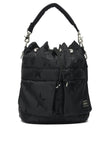 Porter Yoshida "Flag" handbag made of shiny, tightly woven nylon jacquard fabric laminated with cotton for a soft, lightweight texture. The compact silhouette features an adjustable and removable shoulder strap, and a detachable handle for dual use. The Porter logo and star pattern are integrated into the surface, creating a three-dimensional effect according to the direction of light. The main compartment opens sideways via a zipper.