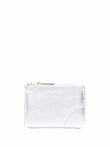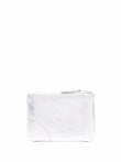 Elevate your everyday essentials with this stunning metallic wallet from COMME DES GARÇONS WALLET. Crafted from 100% genuine cow hide leather in a lustrous silver finish, this compact pouch measures 145x105mm, making it the perfect size for cards, cash, and small essentials. The sleek zip closure keeps your valuables secure while the eye-catching metallic sheen adds a touch of modern sophistication to any look. Whether you're running errands or heading out for the evening, this versatile wallet transitions seamlessly from day to night. A must-have accessory that combines Japanese craftsmanship with contemporary design.