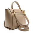 This is an authentic CELINE Grained Calfskin Micro Belt Bag in Light Taupe. This chic handbag is crafted of grained beige calfskin leather. The bag features a leather top handle, an optional shoulder strap, and polished brass hardware. The front flap is secured with a belt strap with decorative knot ends and opens to a matching suede interior with a hanging patch pocket.