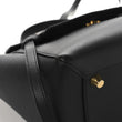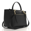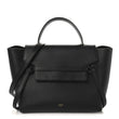 This is an authentic CELINE Grained Calfskin Mini Belt Bag in Black. This chic tote is crafted of grained calfskin leather in black with a structured and spacious silhouette. The bag features a leather strap top handle, optional shoulder strap with gold hardware, and a front-facing flap that is secured by decorative knotted straps. The facing flap opens to a suede interior with leather patch pockets.