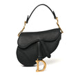 This is an authentic CHRISTIAN DIOR Grained Calfskin Mini Saddle Bag in Black. This bag features the saddle bag shape, with a polished brass "C" and "D" anchors on either end of the handle for handle and a prominent hanging Dior "D" charm. The interior of the bag is a black microfiber textile with a zipper pocket.