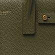 This is an authentic SAINT LAURENT Grained Calfskin Nano Sac De Jour in Loden Green. This elegant tote is crafted of luxuriously grained calfskin leather in olive green. The bag features rolled leather top handles, an optional leather shoulder strap with aged gold hardware, and short side straps that can be undone to increase the width of the bag. The top is open to a green suede leather interior.