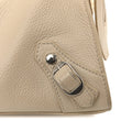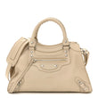This is an authentic BALENCIAGA Grained Calfskin Neo Classic Silver Hardware S City in Cream. This stylish handbag is beautifully crafted of grained calfskin leather in beige. It features top handles with a woven detail and an optional shoulder strap. This bag also features the signature Balenciaga look of a front zipper pocket with hardware including buckles and studs. The top zipper opens to a leather interior with a patch pocket.