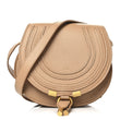 This is an authentic CHLOE Grained Calfskin Small Marcie Saddle in Light Tan. This crossbody bag is crafted of beige calfskin. It features a long, flat adjustable leather crossbody strap with brass hardware and a full frontal flap with decorative stitching that seals with a brass loop. The front flap opens to a fabric interior with a pocket.