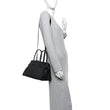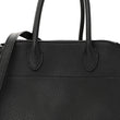 This is an authentic THE ROW Grained Calfskin Soft Margaux 10 Bag in Black. This handbag is crafted of luxuriously grained calfskin leather in black. The shoulder bag features leather buckle straps for width adjustment, an optional leather shoulder strap, silver hardware, and rolled leather top handles attached to a wide-open top, revealing an beige herringbone textile interior with a hanging pocket.