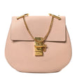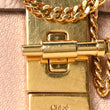 This is an authentic CHLOE Grained Lambskin Drew Shoulder Bag in Cement Pink. This chic messenger style bag is crafted of luxuriously grained lambskin leather in pink. The bag features a long gold chain link crossbody strap and a short squared frontal flap with a peg-and-eye turn-lock closure. This opens to a sand beige suede interior with a hanging patch pocket.