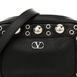 This is an authentic VALENTINO GARAVANI Grainy Calfskin Studded Nellcote Crossbody Bag in Black. This chic bag is crafted of grained calfskin leather in black. The bag features a small silver "V" logo on the front, a leather shoulder strap, and decorative silver studs and rivets throughout. The top zipper opens to a black suede interior with card slots.