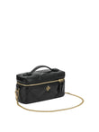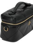 Elevate your travel essentials with this luxurious cosmetic case from Tory Burch. Crafted in supple quilted leather with an elegant diamond pattern, this structured case features a top handle for easy carrying and a secure zip-around closure with signature gold-tone hardware. The compact yet spacious design makes it perfect for organizing your beauty essentials, whether you're jet-setting across the globe or simply heading to the gym. The sophisticated black leather and iconic Tory Burch logo add a touch of refined elegance to your daily routine. This versatile piece seamlessly transitions from your vanity to your carry-on, keeping you impeccably organized wherever life takes you.