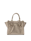Elevate your accessory collection with this stunning metallic satchel from GIANNI CHIARINI. Crafted in luxurious textured leather with a sophisticated champagne-gold finish, this structured bag features classic top handles and an elegant trapeze silhouette with distinctive winged sides.