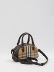 BEIGE SAND CHECK-PATTERNED COTTON AND LINEN BLEND BAG WITH BROWN SMOOTH CALF LEATHER TRIMS. FEATURES TWO FIXED TOP HANDLES, AN ADJUSTABLE AND REMOVABLE SHOULDER STRAP, DOUBLE-ZIP CLOSURE, AND LEATHER TAGS WITH THE EQUESTRIAN KNIGHT DESIGN ON THE FRONT. ONE MAIN COMPARTMENT. DUST BAG INCLUDED.