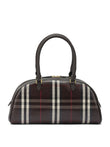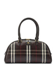 Burberry "Highlands" handbag bag, constructed from cotton-linen blend fabric, features a rigid bowling silhouette. The structure features smooth calfskin leather trim and a cotton-lined interior. Burberry Check jacquard decorates the surface, while the coated finish echoes the look of rainwear. Rounded leather top handles and an adjustable, detachable shoulder strap complete the functionality.