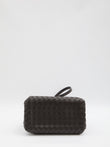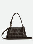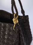 The structured dome silhouette features elegant braided top handles and a detachable shoulder strap, offering versatile carrying options for any occasion. The luxurious woven leather construction and gleaming gold-tone hardware make this bag a true investment piece that transitions seamlessly from the office to evening engagements.