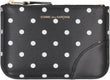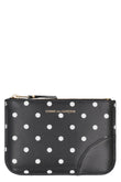 ELEGANT WALLET IN BLACK LEATHER, DECORATED WITH A POLKA DOT MOTIF. ITS COMPACT STRUCTURE IS IDEAL FOR HOLDING CARDS, COINS, AND BANKNOTES. THE ZIP CLOSURE OFFERS CONVENIENCE AND PRACTICALITY FOR EVERYDAY USE. PERFECT FOR ADDING A TOUCH OF STYLE TO ANY OUTFIT.