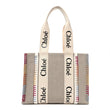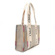 This is an authentic CHLOE Linen Canvas Calfskin Blanket Stitched Medium Woody Ribbon Tote in White and Multicolor. This chic tote is crafted of durable linen fabric with multicolor stitch detailing. The bag has smooth leather trims and shoulder straps, with a beige fabric interior with a pocket.