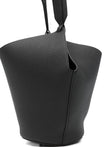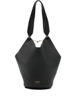 Introducing the Lotus Mini Leather Bucket Bag by Khaite, a sophisticated accessory that effortlessly combines luxury with everyday functionality. This stunning black leather bucket bag features a beautifully textured finish and elegant chain detailing at the top handle, adding a touch of refined hardware to the minimalist silhouette.