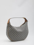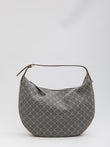 ECRU AND NAVY BLUE TRIOMPHE JACQUARD BAG WITH BROWN LEATHER INSERTS. IT FEATURES AN ADJUSTABLE HANDLE, CELINE SIGNATURE ON THE BUCKLE, ZIP CLOSURE, ONE MAIN COMPARTMENT, AND GOLD-TONE FINISH. DUSTBAG INCLUDED. ANY IMPERFECTIONS IN THE LEATHER SHOULD NOT BE CONSIDERED MANUFACTURING DEFECTS, BUT A CHARACTERISTIC OF THE MATERIAL.