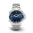 Unworn Panerai Luminor Chrono PAM01110. 44 mm, Blue dial, AISI 316L brushed steel case, Polished Steel bezel, P.9200 calibre, Automatic mechanical Movement, 41 jewels, 42 hours power reserve, Steel Steel straps. Water resistant to 100 m.