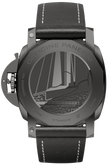 Unworn Men’s Watch Panerai Luminor Luna Rossa GMT - 44mm, of black DLC titanium case, Reference PAM01036. The model has Dark grey sail dial with polished black hands with luminous fill. This watch is engraved hour markers in a combination of Arabic Numerals in the 6, 9, and 12 o'clock positions and indexes with luminous fill. Small seconds sub-dial located at the 9 o'clock position, with bold luminous 15 seconds markers. A small red luminous leaf-shaped hand is used for the small seconds sub-register. This Officine Panerai signature element speaks innovation and seamless function. Date window located 3 o'clock position. The dial closed by a Scratch-resistant Sapphire Crystal. The watch has Panerai's (protected as a trademark) instantly recognizable crown protector of Black DLC titanium and screw down Pull/push crown DLC titanium with a ribbed edge for a comfortable grip. They have case shape Round and a Solid case back in titanium with black coating and Engraved. The watch is equipped fixed Black DLC titanium bezel. The Model comes with Automatic mechanical movement Panerai Caliber P.9010/GMT contains 31 Jewels and has an approximate power reserve of 72 hours. The watch presented on a Black Calf Ponte Vecchio strap with secured by a black DLC-coated titanium large-sized Tang Buckle. The water resistance is up to 300m/1000ft.