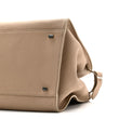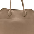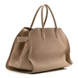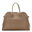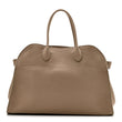 This is an authentic THE ROW Matte Grained Calfskin Soft Margaux 15 in Dark Taupe. This is crafted of beige grained calfskin leather. This features rolled leather top handles and silver hardware. The open top leads to a fabric interior with zipper and patch pockets.