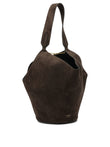 Khaite "Lotus" shoulder bag, constructed of suede, inspired by the fluid shape of a scarf. The structure is free of rigid seams and favors a soft silhouette designed to ensure lightness. The base is rounded, designed to ensure stability and volume. Internal closure with metal frog, inserted as a functional and distinctive element. It can be worn on the shoulder.