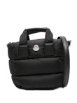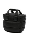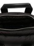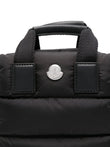 HAND OR CROSSBODY BAG IN BLACK WATER-REPELLENT QUILTED NYLON. FEATURING A SCULPTURAL TRAPEZE SHAPE, WEBBING HANDLES WITH LEATHER GRIPS, METAL LOGO ON THE FRONT, ADJUSTABLE AND REMOVABLE LEATHER SHOULDER STRAP, ZIP CLOSURE, MAIN COMPARTMENT, AND OPEN POCKET. DUST BAG INCLUDED.