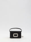 MICRO BAG IN BLACK SATIN. IT FEATURES A FIXED HANDLE, A PILGRIM CRYSTAL BUCKLE ON THE FRONT, A MAGNETIC BUTTON CLOSURE, A REMOVABLE METAL CHAIN SHOULDER STRAP, ONE INTERNAL COMPARTMENT, AND AN INTERNAL POCKET. DUST BAG INCLUDED.