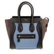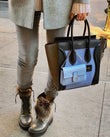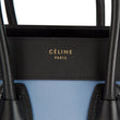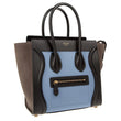 Outside: black calfskin, blue and taupe-colored details two handles (about 45 cm) zipper gold-colored, embossed logo on the front antique gold-colored metal details a zippered pocket on the front four metal feet