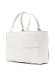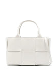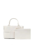 WHITE LAMBSKIN SMOOTH GRAIN RECTANGLE BODY SIGNATURE MAXI INTRECCIATO DESIGN TWO ROLLED TOP HANDLES ADJUSTABLE DETACHABLE SHOULDER STRAP DEBOSSED LOGO TO THE SIDE MAIN COMPARTMENT REMOVABLE POUCH TOP TIE FASTENING THIS PIECE COMES COMPLETE WITH A PROTECTIVE DUST BAG.