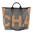 This is an authentic CHANEL Mixed Fibers Large Shopping Bag in Blue and Beige . This tote is crafted of raffia, black fabric trim and silver hardware. This bag features black leather top handles and chain leather threaded straps. The top opens to a matching interior with black fabric zipper pockets.