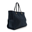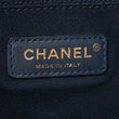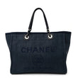 This is an authentic CHANEL Mixed Fibers Small Deauville Tote in Navy Blue. This tote is crafted of blue canvas, printed with a blue historic Chanel advertisement stitched logo on the front. The bag features light gold chain shoulder straps threaded with grosgrain fabric, matching fabric trim, and an open top that reveals a spacious blue fabric interior with zipper and patch pockets.