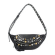 BLACK GRAINED LEATHER BELT BAG DECORATED WITH METAL STUDS. FEATURES AN ADJUSTABLE BELT STRAP, METAL VLOGO SIGNATURE ON THE FRONT, ZIP CLOSURE, ONE MAIN COMPARTMENT, ONE CARD SLOT, AND SUEDE LINING. DUST BAG INCLUDED. ANY IRREGULARITIES IN THE LEATHER ARE NOT TO BE CONSIDERED DEFECTS, BUT RATHER UNIQUE CHARACTERISTICS OF THE MATERIAL.