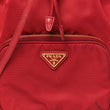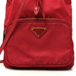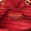 This is an authentic PRADA Nylon Vela Saffiano Mini Bucket Crossbody Bag in Fuoco. This stylish bag is crafted of nylon in red. The bag features a facing zipper pocket, a top cinch strap, and a leather strap with brass buckles and links. The top opens to a red Prada jacquard fabric interior.
