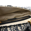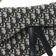 This is an authentic CHRISTIAN DIOR Oblique Saddle Bag in Blue. This shoulder bag is made of navy on beige Dior monogram canvas. It features blue cowhide leather trim, a leather handle, and brass hardware. The flap opens to a beige fabric interior with a zipper pocket.