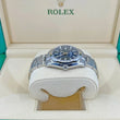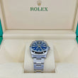 Rolex Oyster Perpetual, Brushed Stainless Steel case with polished finished sides 34mm watch. This model has Bright blue dial with highly legible Chromalight display with long-lasting blue luminescence with a fine sunray finish. Applied polished index hour markers with luminous fill. Polished hands, hour and minute hands with luminous fill. Fine printed minute/seconds and fractions of a second track on teh dial perimeter. Moreover, every five minutes are marked with a Roman numeral. Polished Stainless Steel screw-down crown with Rolex's patented "Triplock" triple waterproofness system, ensuring that the crown screws down against the Oyster case as securely as a submarine hatch. The dial closed by a Scratch-resistant Sapphire Crystal and solid case back made. The watch is equipped domed fixed polished silver-tone Stainless Steel bezel. The watch is mechanical self-winding Manufacture Rolex 2232 contains 31 Jewels and has an approximate power reserve of 55 running the time only. This model presented on Brushed Stainless Steel Oyster bracelet with flat three-piece links and a Folding Oysterlock safety clasp with Easylink 5 mm comfort extension link. The water resistance is up to 100m/330ft (10 ATM).