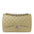 This is an authentic CHANEL Patent Calfskin Quilted Jumbo Double Flap in Grey. This stunning shoulder bag is crafted of fine diamond quilted glossy patent leather in grey-taupe. The bag features silver chain link shoulder straps threaded with leather and a frontal flap with a silver Chanel CC Mademoiselle turn lock. This opens to a matte gray leather interior with patch pockets.