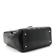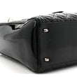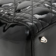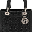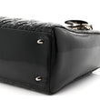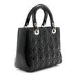 This is an authentic CHRISTIAN DIOR Patent Cannage Medium Lady Dior in Black. This chic tote is crafted of geometric quilted patent leather in black. The handbag features sturdy patent leather top handles with silver hardware, and hanging Dior logo charms. The top zipper opens to a black Dior monogram jacquard fabric interior with a zipper pocket.