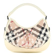 This is an authentic BURBERRY Patent Supernova Check Stars Small Hernville Hobo in White. The bold features and refined quality of this Burberry hobo are beautifully crafted of checked coated canvas and with white colored stars. The bag features a sturdy patent leather top handle and trim with dark silver hardware. The top zipper opens to a fabric interior with zipper and patch pockets.