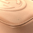 This is an authentic GUCCI Pebbled Calfskin Small Soho Disco Bag in Camelia. This stylish crossbody bag is crafted of pebbled calfskin leather in rose-toned beige. The bag features an adjustable leather shoulder strap with polished light gold hardware and a prominent interlocking GG logo stitched on the front. The leather tassel zipper pull opens the bag to a natural fiber interior with patch pockets.