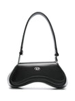 Introducing the Diesel Play Play Crossbody, a statement-making accessory that redefines contemporary bag design with its distinctive curved silhouette. Crafted from premium black leather with sleek silver-tone hardware, this unique kidney-shaped bag offers both style and functionality.