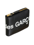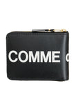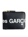 This sleek leather wallet from COMME DES GARÇONS WALLET combines minimalist design with exceptional functionality. Crafted from premium black leather and featuring the brand's iconic logo in bold white lettering, this compact accessory is perfect for those who appreciate understated luxury. The zip closure keeps your essentials secure, while the interior offers three card slots, a coin pocket, and one main compartment for bills and receipts.