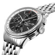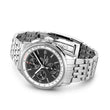 Breitling Premier Chronograph 42 watch, 42mm, brushed and polished finished stainless steel case, Reference A13315351B1A1. This model has Black dial with luminous filled silver-tone hour and minute’s hands and applied index hour markers. Silver dial flange with Tachymeter scale. Fine printed minutes/seconds and fraction-of-a-second track. Small running seconds sub-dial located at the 9 o'clock position. Date window located the 6 o'clock positions. Chronograph functions: Central seconds counter hand; 30-minute counter sub-dial at 12 o'clock; 12-hour counter sub-dial at 6 o'clock. Pull / push crown of polished Stainless steel Non Screw-locked with a non-slip grip, two gaskets and logo Breitling. The dial closed by a Cambered Scratch-Resistant sapphire crystal, glare-proofed both sides. The screwed solid case back is made of Stainless Steel. The watch is equipped fixed Stainless Steel bezel. The watch is self-winding mechanical Breitling in-house caliber 13 contains 25 jewels and has an approximate power reserve of 48 hours. This model presented on a seven-row polished Stainless Steel Curved bracelet with a Push Button Folding Clasp. The water resistance is up to 100m/330ft.