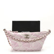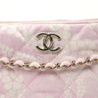 This is an authentic CHANEL Printed Denim Quilted Large Hobo Bag in Light Pink and White. This chic bag is crafted with pink-washed printed denim. It features an adjustable leather handle with a snap closure, a leather threaded gold chain shoulder strap, and a CC logo on the front. The top opens to a matching fabric interior.
