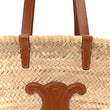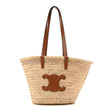 This is an authentic CELINE Raffia Calfskin Triomphe Medium Panier in Tan. This tote is crafted of a light beige woven raffia. The bag features brown leather top handles, a brown leather shoulder strap, and triomphe detail on the front. The top is open to a matching raffia interior.