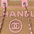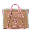 This is an authentic CHANEL Raffia Crochet Medium Deauville Tote in Beige, Light Pink, and Green. This lovely woven tote is crafted of fine raffia with an iconic Chanel logo on the front in beige, light pink, and green. The bag features a pink leather threaded gold chain shoulder straps with a multicolor raffia exterior. The top opens to a pink fabric interior features zipper and patch pockets.