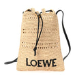 This is an authentic LOEWE Raffia Logo Drawstring Pocket Crossbody in Natural, Black. This chic crossbody is crafted of woven straw raffia. The bag features a black Loewe logo on the front with a black leather drawstring strap. The top is open to a matching interior.