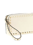 Elevate your evening ensemble with the Valentino Garavani Rockstud Leather Mini Bag in luxurious cream. This iconic wristlet features the signature pyramid stud appliqué detailing that has become synonymous with the Valentino brand, adding an edgy yet sophisticated touch to any outfit.