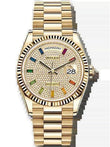 36mm 18K yellow gold case, screw-down back, screw-down crown with twinlock double waterproofness system, fluted bezel, scratch-resistant sapphire crystal with cyclops lens over the date, diamond-paved dial, rainbow-colored sapphire hour markers, Rolex calibre 3255 perpetual self-winding movement with centre hour, minute and seconds hands, instantaneous day and date in apertures, unrestricted rapid-setting, and stop-seconds for precise time setting, approximately 70 hours of power reserve, 18K yellow gold President bracelet with semi-circular three-piece links, concealed folding Crownclasp buckle. Waterproof to 100 meters. Baselworld 2019 release.