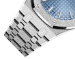 Unworn Audemars Piguet Royal Oak FROSTED GOLD SELFWINDING 77353BC.GG.1263BC.01. 34 mm, Light blue dial with “Grande Tapisserie” pattern, white gold applied hour-markers and Royal Oak hands with luminescent coating, Hammered 18-carat white gold case, glareproofed sapphire crystal and caseback, 5800 calibre, Selfwinding movement, 50 h power reserve, 28 jewels, Hammered 18-carat white gold bracelet with AP folding clasp. Water resistant to 50 m.