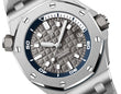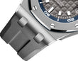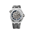 Unworn Audemars Piguet Royal Oak Offshore DIVER 15720ST.OO.A009CA.01. 42 mm, Grey dial with “Méga Tapisserie” pattern, white gold applied hour-markers and Royal Oak hands with luminescent coating, blue rotating inner bezel with zone from 60 to 15 minutes in white, Stainless steel case, glareproofed sapphire crystal and caseback, black ceramic screw-locked crowns, 4308 calibre, Selfwinding movement, 60 h power reserve, 32 jewels, Grey rubber strap with AP folding clasp. Water resistant to 300 m.