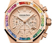 Unworn Audemars Piguet Royal Oak Offshore SELFWINDING CHRONOGRAPH 26236OR.YY.D085CA.01. 37 mm, Smoked pink gold-toned dial with “Lady Tapisserie” pattern, pink gold-toned counters, pink gold applied hour-markers and Royal Oak hands with luminescent coating, 18-carat pink gold case, glareproofed sapphire crystal, bezel set with baguette-cut “rainbow-coloured” sapphires, 18-carat pink gold pushpieces and screw-locked crown, 2385 calibre, Selfwinding movement, 40 h power reserve, 37 jewels, Beige rubber strap with AP folding clasp. Water resistant to 50 m.